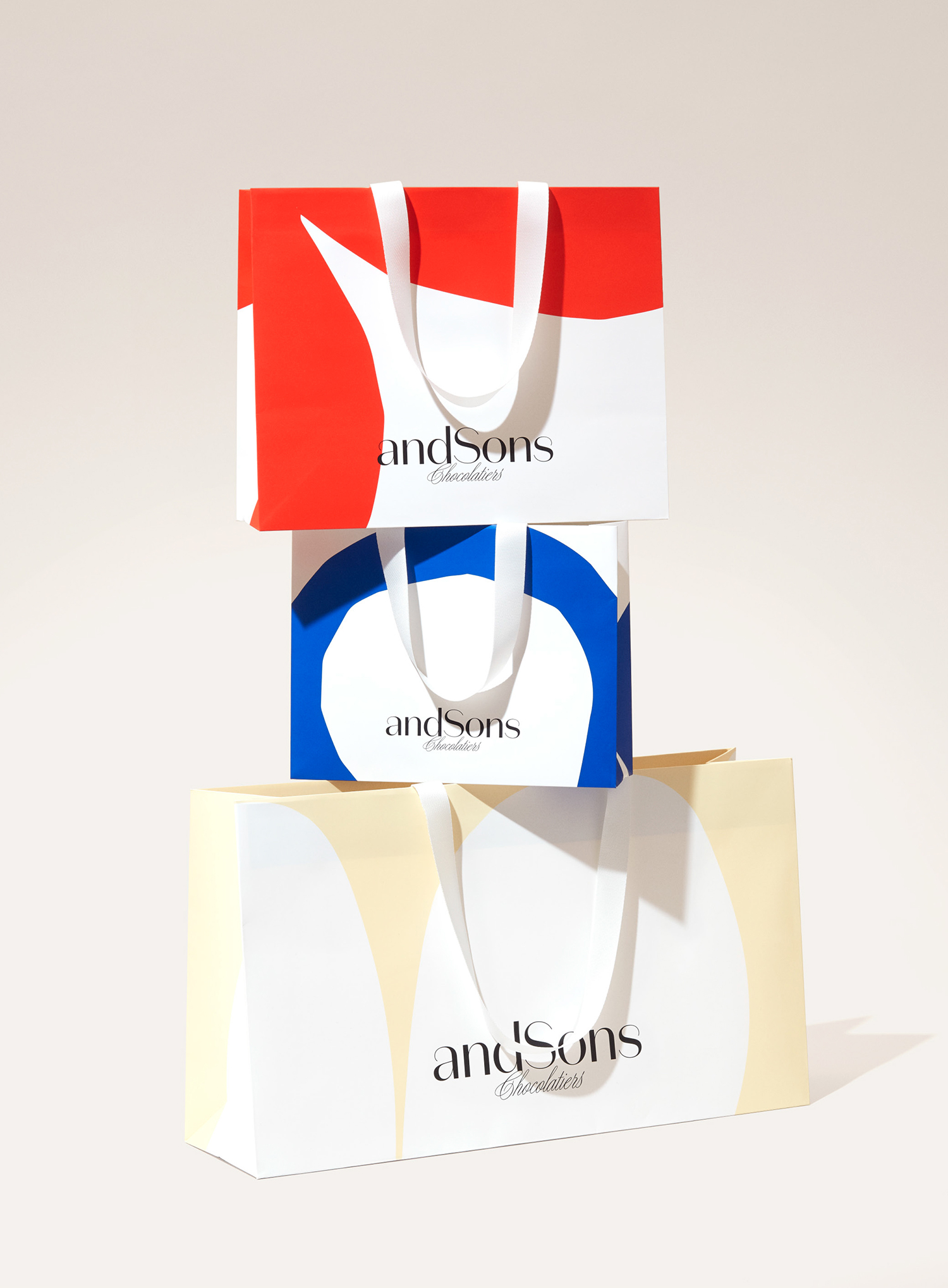 andSons是一家第二代巧克力制造商和零售商,由Marc和Phil Covitz經(jīng)營,他們兩兄弟從母親那里學到了所有關(guān)于優(yōu)質(zhì)巧克力的知識。在十大糕點廚師克里斯·哈維(Kriss Harvey)和兄弟們的共同推動下,父子公司試圖為手工巧克力世界提供新的東西,在他們的傳統(tǒng)歐洲傳統(tǒng)和所在地洛杉磯的當代創(chuàng)意之間找到了一個界限。考慮到這一定位,公司委托Base Design創(chuàng)建一個標志性的圖形標識和包裝設(shè)計,該設(shè)計將捕捉基于傳統(tǒng)的創(chuàng)新精神,既精致又奢華,同時又有趣又令人驚訝。這些意圖交織在一起,并通過簡單而優(yōu)雅的標識、醒目的彩色圖案和白色空間,以及使用彩色箔和可互換的袖子來表達。